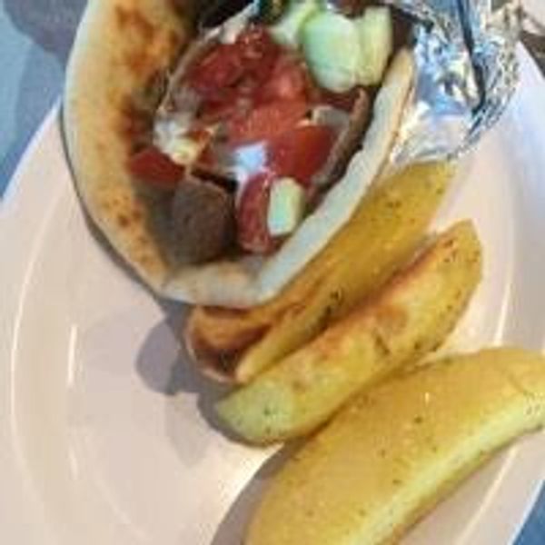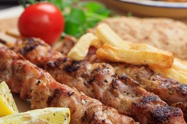 Chunks of marinated, grilled pork chunks with lettuce, tomato, onion and tzatziki.