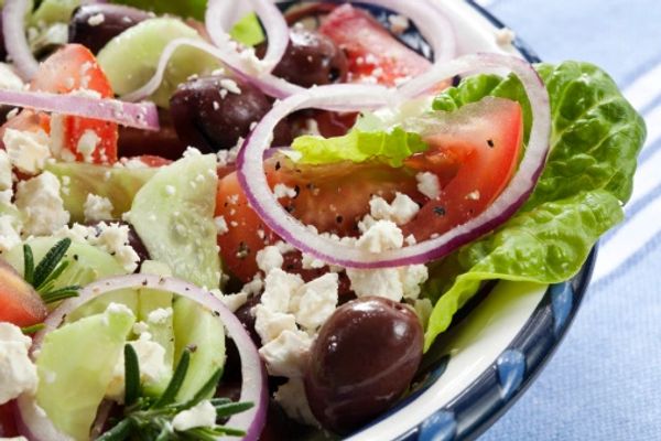 Lettuce, tomato, onion, green pepper, cucumber, feta cheese, topped with house dressing